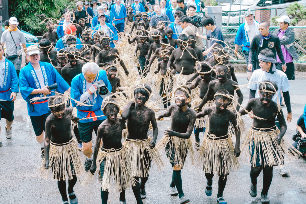 当日は地区の小学生男児約50人が、全身を炭で真っ黒に塗り、腰にはワラミノ、頭には角に見立てた縄を巻いて黒鬼に変身!直径30センチ、長さ20メートル、重さ約400キロの立派な盆綱を曳いて、「ワッショイ!ワッショイ!」の掛け声とともに約3キロの道のりを練り歩きます。福岡県の無形民俗文化財に指定されています。